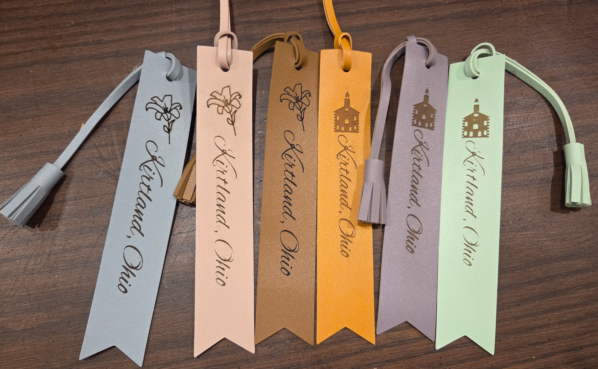 These beautiful leather bookmarks with tassles are engraved with Kirtland, Ohio, and either a Temple or a flower. They come in 6 colors- brown, tan, pink, purple, sea green, and blue.